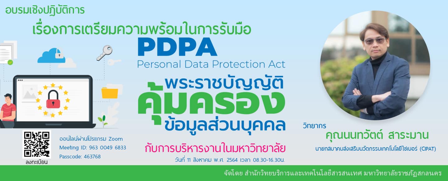 จัดการอบรมเชิงปฏิบัติการ เรื่องการเตรียมความพร้อมในการรับ พระราชบัญญัติคุ้มครองข้อมูลส่วนบุคคล PDPA ที่มหาวิทยาลัยราชภัฎสกลนคร เมื่อวันที่ 11 สิงหาคม 2564 ตั้งแต่ 9:00 – 16:00 พร้อมการทำ Workshop เป็นการจัดอบรมออนไลน์