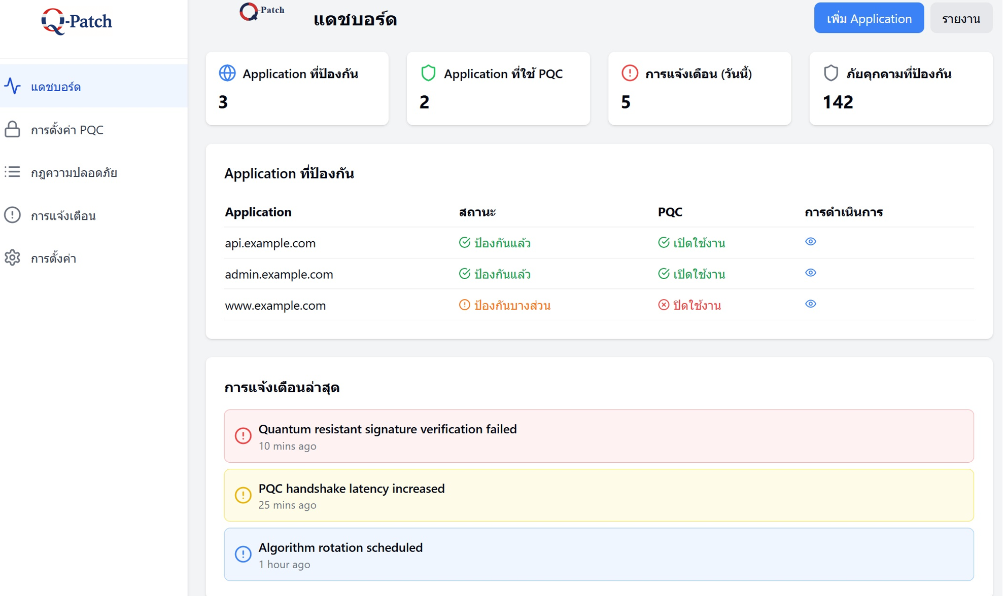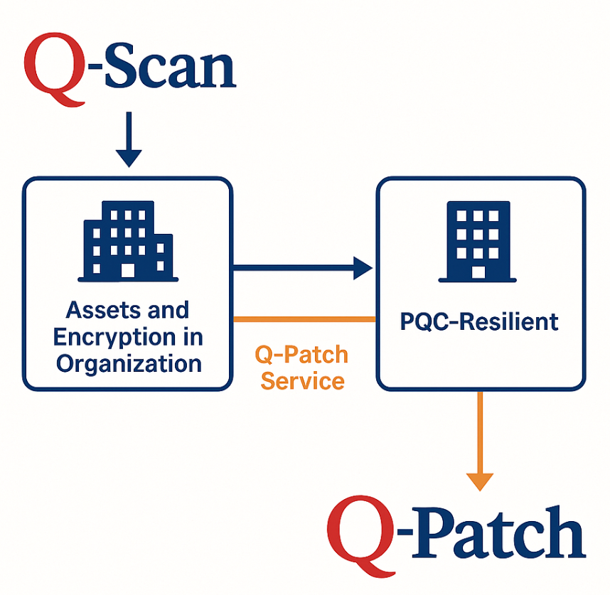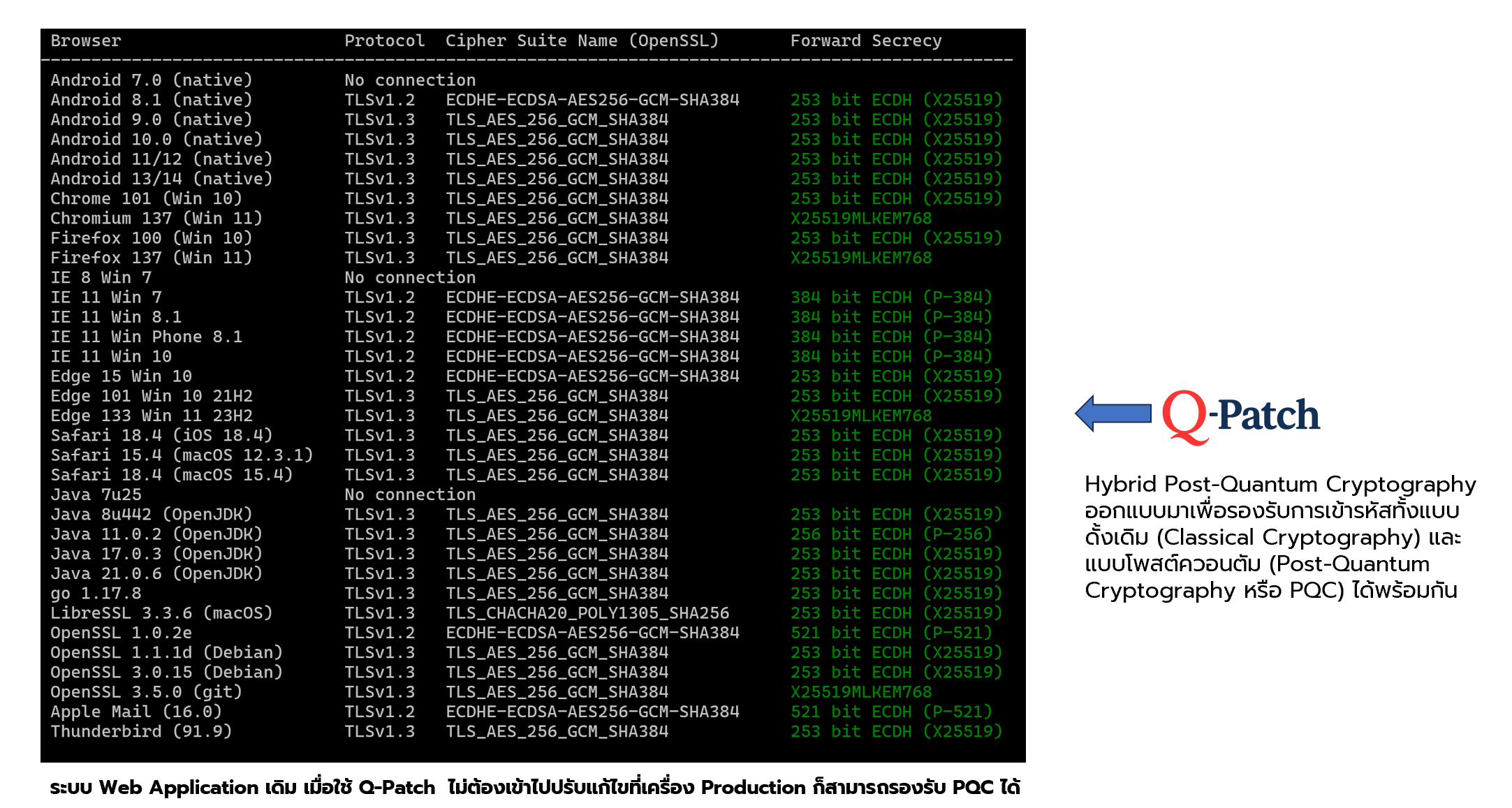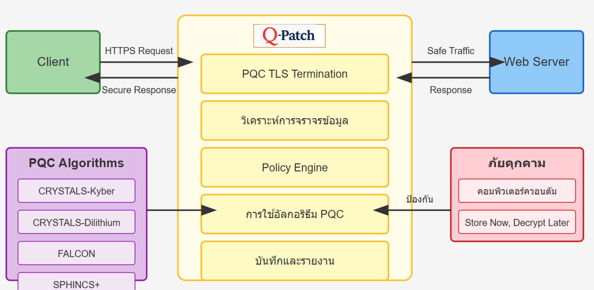คือโซลูชันที่ช่วยให้องค์กร รองรับ PQC (Post Quantum Cryptography) โดยไม่ส่งผลกระทบต่อระบบเดิม และองค์กรที่ไม่สามารถอัพเกรดเป็น PQC ได้ การทำงานของ Q-Patch เป็นแบบ Virtual patch security เพื่อให้องค์กรรองรับการเข้ารหัส PQC และป้องกันการโจมตีจากถอดรหัสจาก Quantum Computing ได้