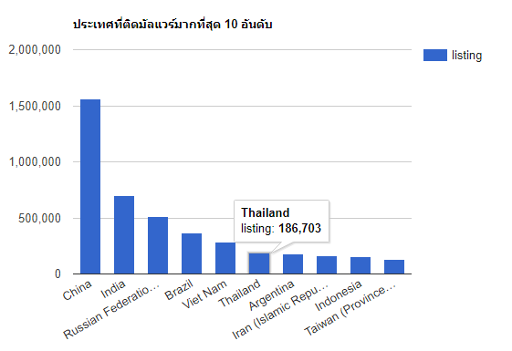กราฟเมื่อวันที่ 22 กรกฎาคม 2560 ประเทศไทยติดอันดับ 6 ที่ติดเชื้อมัลแวร์มากที่สุด คือจำนวน 186,703